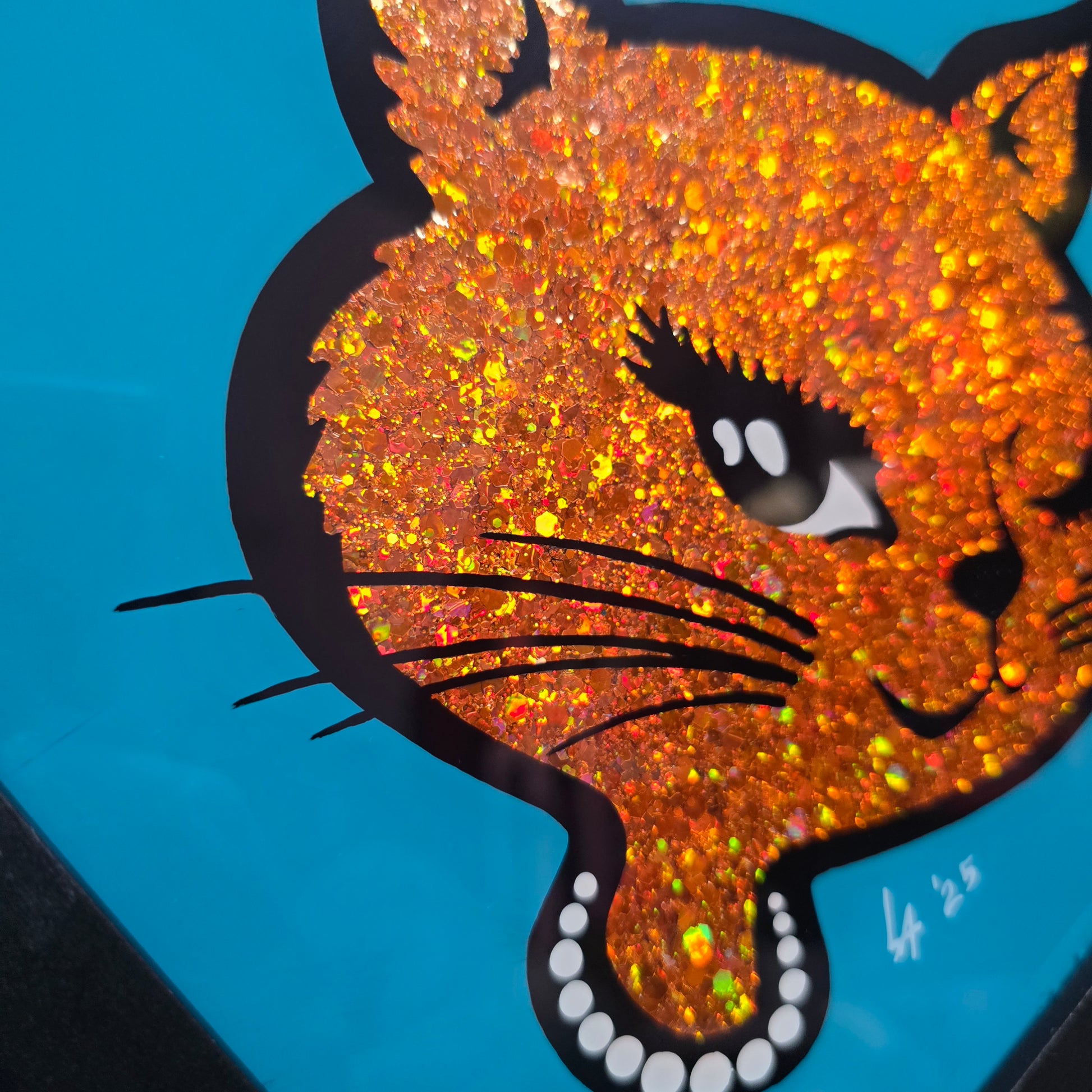 90's Winking Cat "Sticker" Bright Teal & Orange Glitter