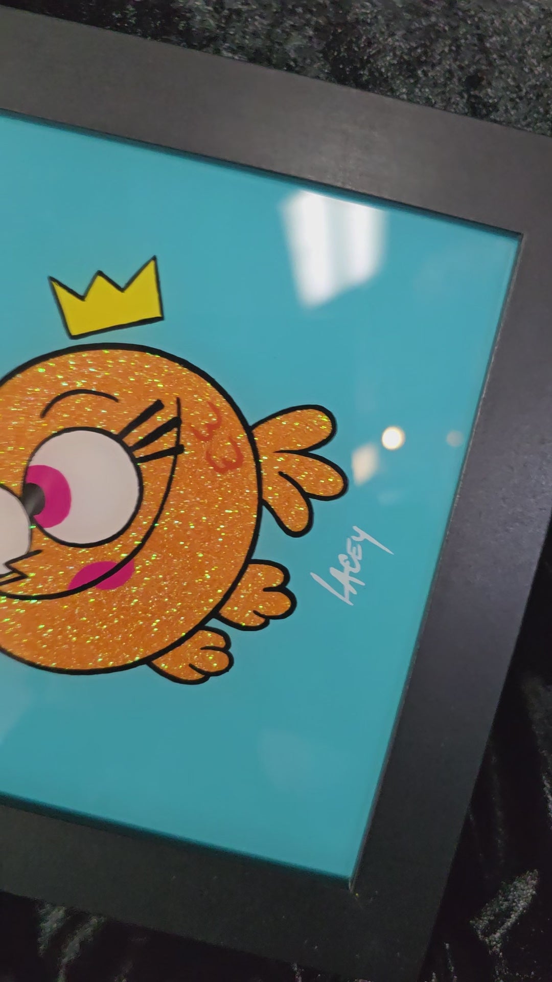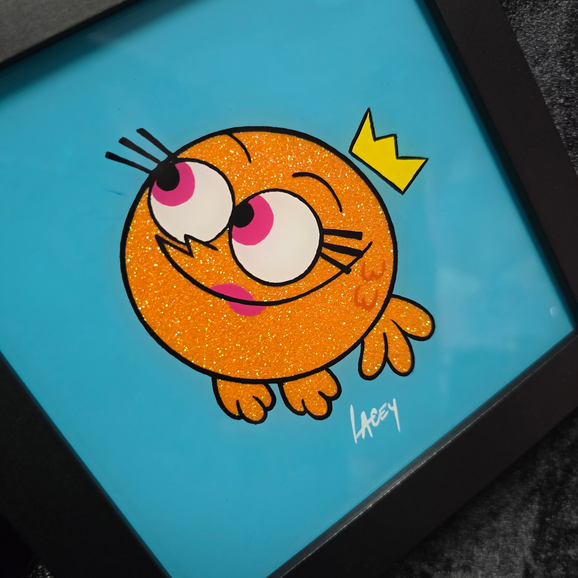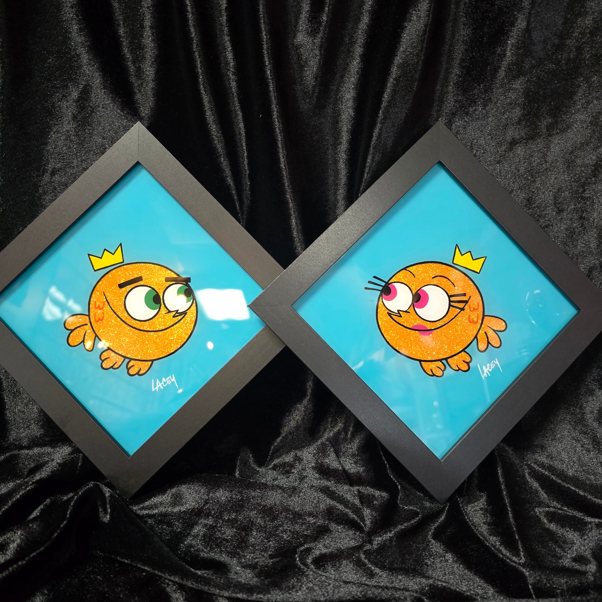 Each piece is hand painted by me, signed and backed with black velvet. Enamel on glass 6x6 black frame.