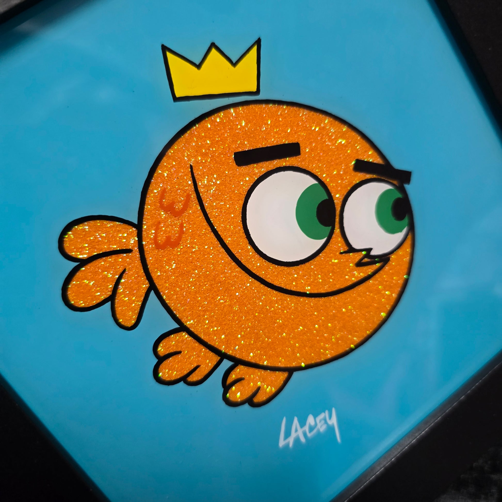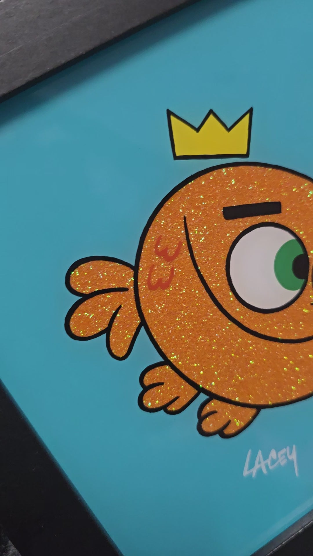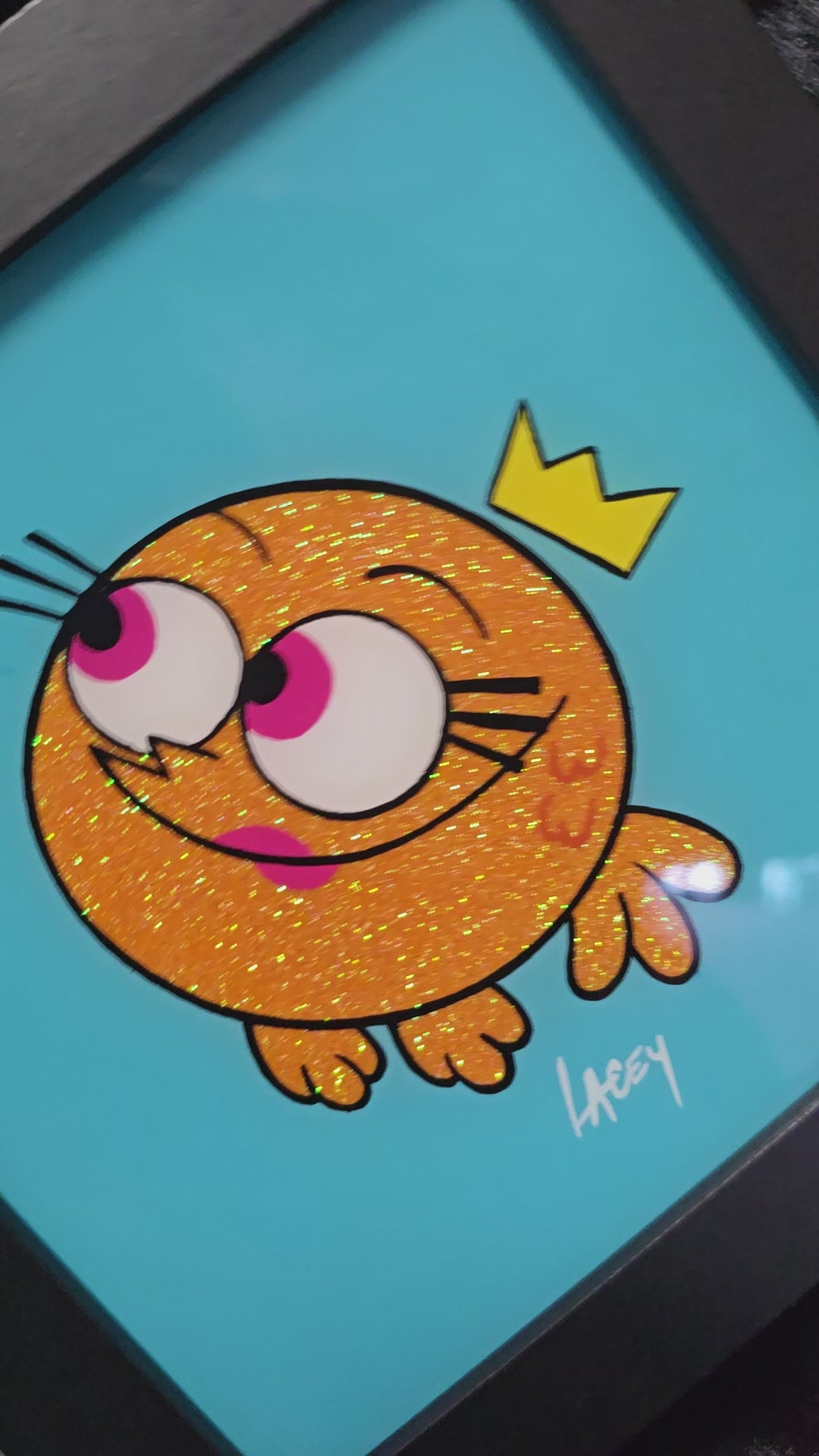 Each piece is hand painted by me, signed and backed with black velvet. Enamel on glass 6x6 black frame.