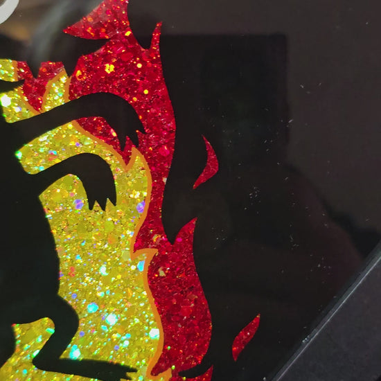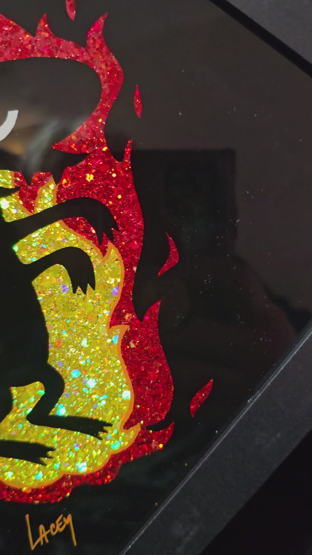 Each piece is hand painted by me, signed and backed with black velvet. Enamel on glass 8x8 black frame.