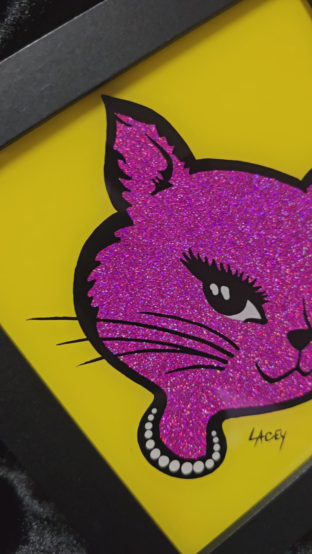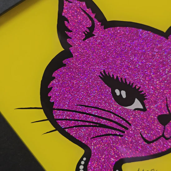 90's Winking Cat "Sticker" Yellow with Pink Micro Glitter